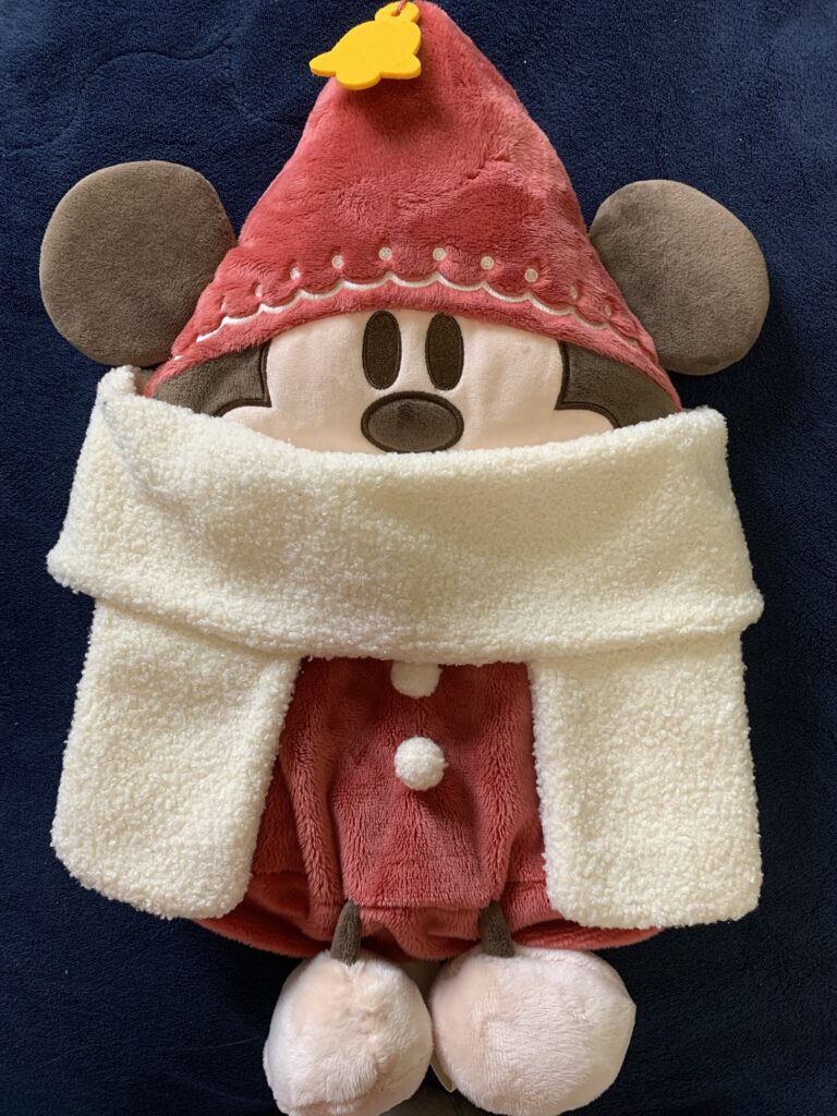 冬らしいぬくもりをそのまま形にしたようなデザインのブランケットです。もこもこマフラーの質感がリアルで、抱えると癒し効果抜群。なんといってもその機能性に拍手!ブランケットとしても肌触り抜群で優秀だし、使わない時は収納してぬいぐるみクッションに早変わり。置いておくだけでも可愛くて癒やされる!しかもパークでショーパレ待ちをするときにも大活躍します!