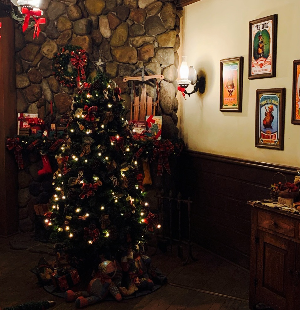 一際目立っているのは、大きなクリスマスツリー。木の温もりと石壁が、なんとも落ち着く空間を作っています。ツリーの足元にはプレゼントやぬいぐるみが置かれていて、まるでベアたちのホームパーティーにお呼ばれしたみたい。