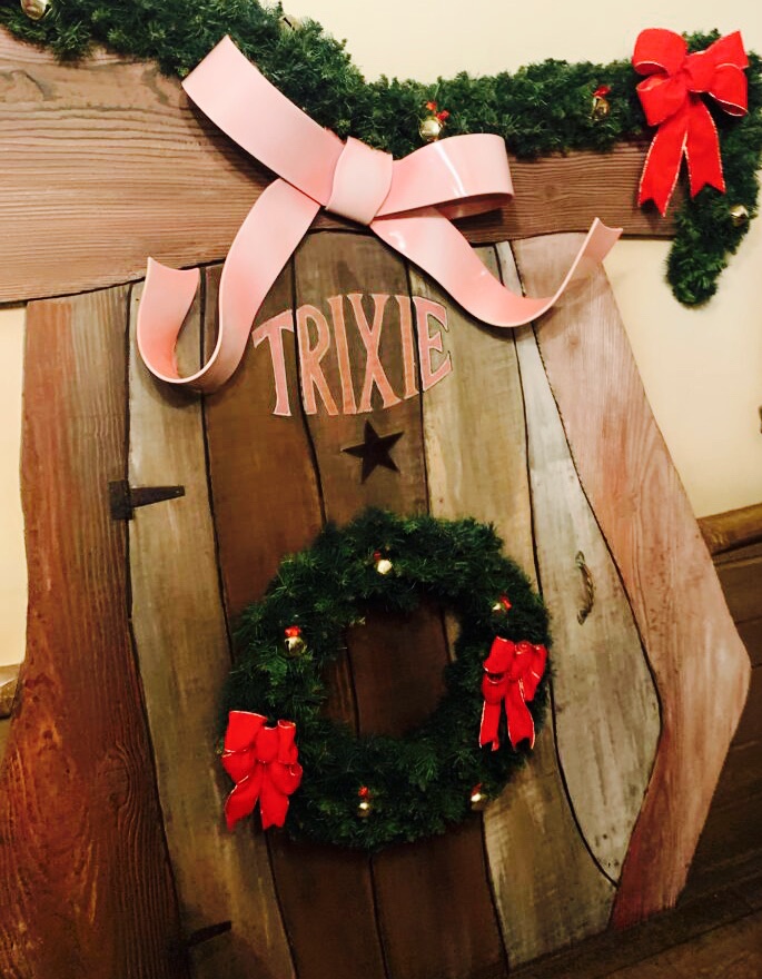 ここはトリクシーのドアらしく、リボンとリースで華やかに飾られています。素朴な木の質感がこのショーならではの世界観にぴったり。